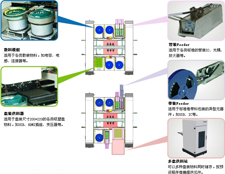 可配置各式供料站 | 散裝、帶裝、管裝、盤裝、多盤供料站(*z) |